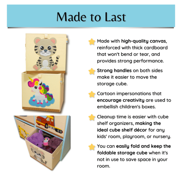 - ✅Unique Design 13 Inch Cube Storage Bins – This kids storage chest and toy box storage are decorated with cartoon imitations that inspire creativity. It is made of peach skin polyester canvas with hand stitched designs. The outer fabric is designed to withstand spills and stains, while the inner fabric is made from thicken high-density 210D for added strength