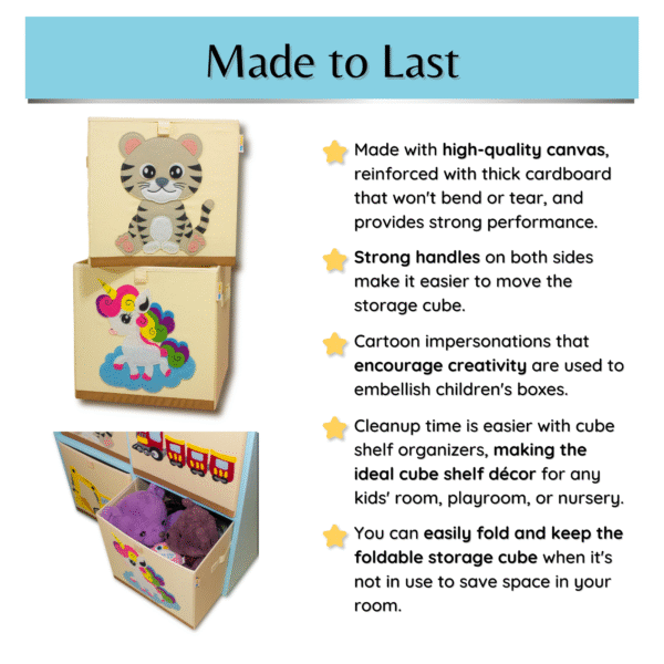 - ✅Unique Design 13 Inch Cube Storage Bins – This kids storage chest and toy box storage are decorated with cartoon imitations that inspire creativity. It is made of peach skin polyester canvas with hand stitched designs. The outer fabric is designed to withstand spills and stains, while the inner fabric is made from thicken high-density 210D for added strength